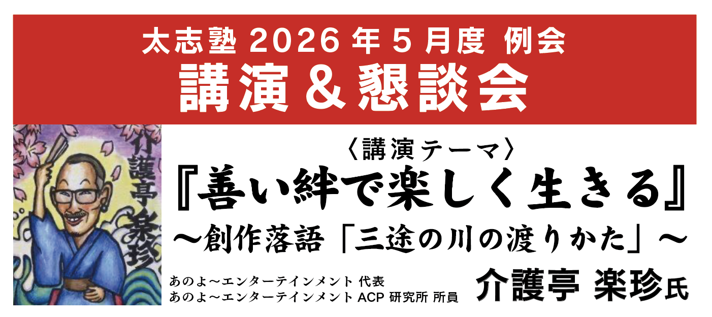 親愛なる会員の皆様、お元気様です!2026年5月29日に開催する5月例会は、あのよ~エンターテインメント代表の介護亭 楽珍氏に、『善い絆で楽しく生きる』をテーマに講話いただきます!また、創作落語 演目「三途の川の渡りかた」も披露いただきます。現代をともに力強く乗り越えるためのヒントを得ましょう!ご参加お待ちしております。
